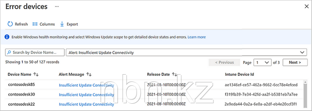 Устройства с недостаточным подключением к обновлению можно отслеживать через Microsoft Intune, перейдя в «Устройства» > «Монитор» и выбрав либо «Ошибки обновления компонентов», либо отчет об ошибках ускоренного обновления Windows.